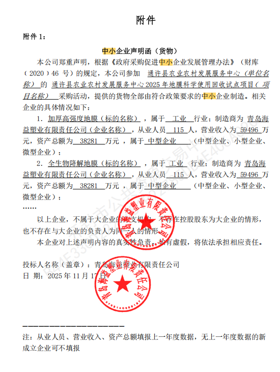 | 5.1项目概况:为进一步推动全县地膜科学使用回收工作,有效解决地膜残留污染问题不断提升地膜回收处理水平,决定开展2025年地膜科学使用回收试点项目。 ******街道),在西瓜、蔬菜等适用作物上推广不低于0.015毫米加厚高强度地膜16万亩,需求量320吨。在马铃薯、大蒜等适用作物上推广不低于0.006毫米符合国家标准的全生物降解地膜0.5万亩,需求量40吨。 5.3供货期限:一年(按采购人要求完成项目全部供货) 5.4质量要求:合格,符合国家相关行业验收标准,且满足采购人要求。 5.5标包划分:本项目共划分一个标包 | |||||||||||||||||||||||||||||||||||||