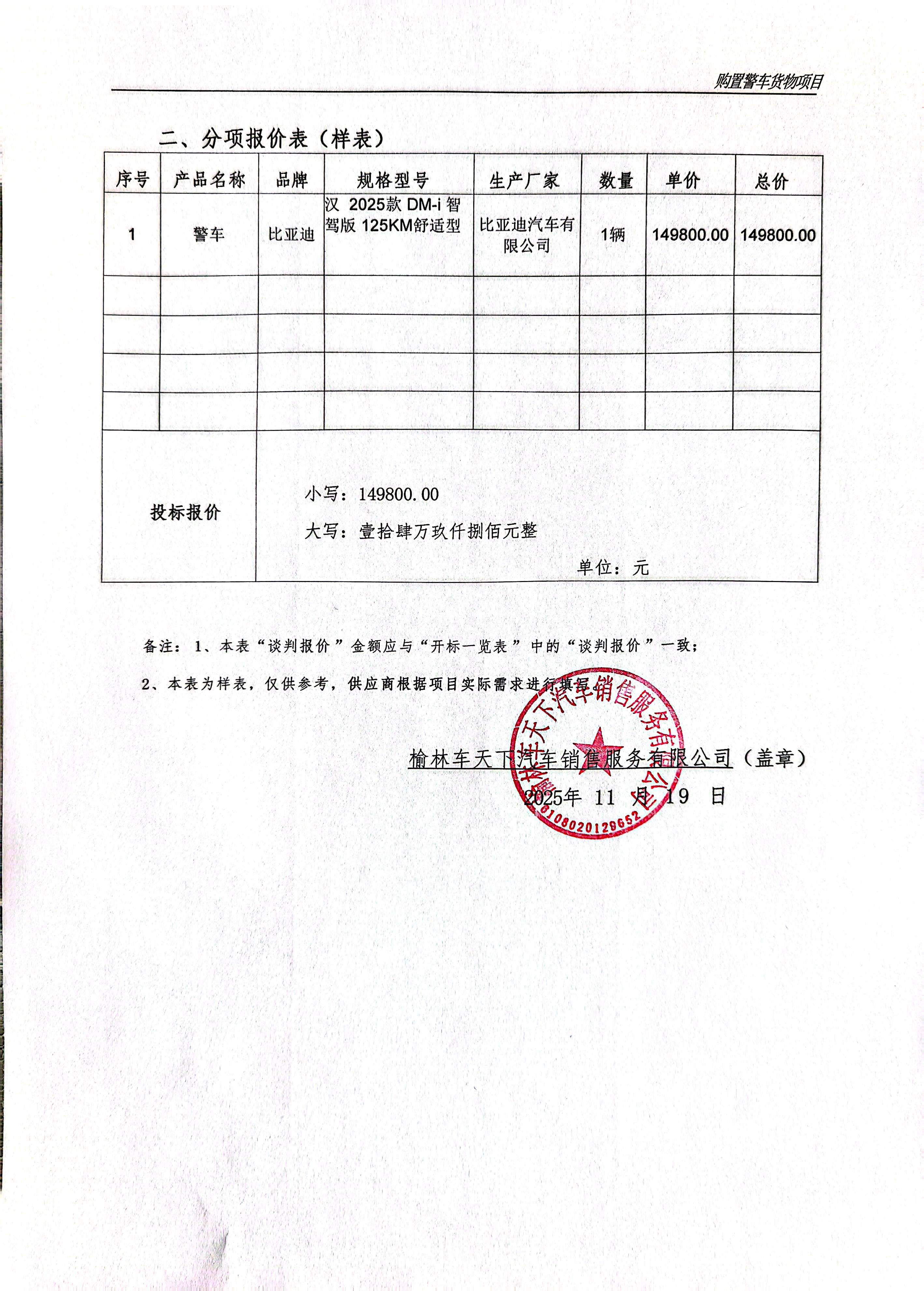 | 1 | 警车 | 警车 | 比亚迪 | 汉2025款DM-I智驾版125KM舒适型 | 1.00(辆) | 149,800.00 | 149,800.00 |