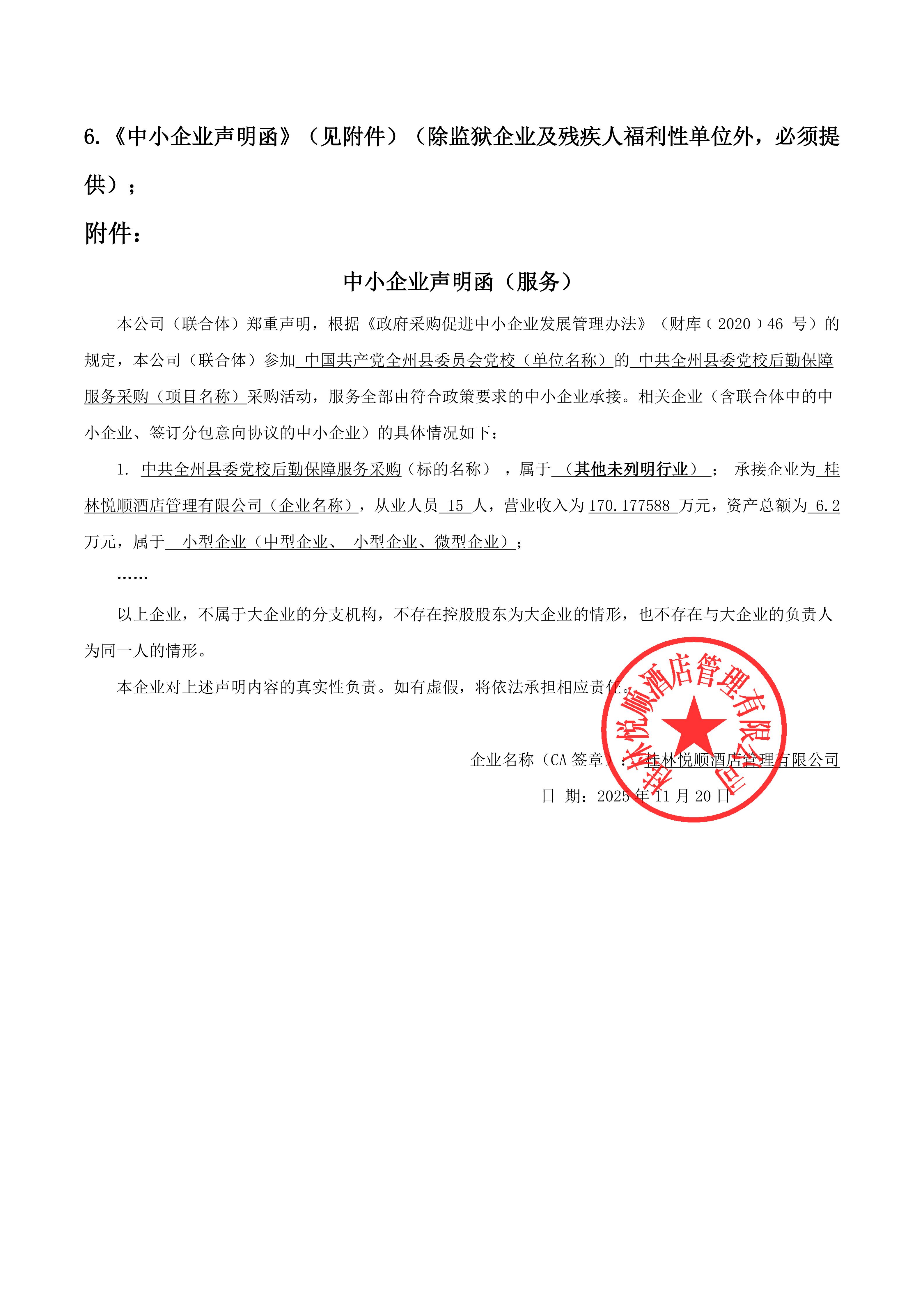| 1 | 中共全州县委党校后勤保障服务采购 | 中共全州县委党校后勤保障服务采购 | 住宿服务、餐厅餐饮服务。 | 详见招标文件《采购需求》 | 自签订合同之日起 3 年。 | 详见招标文件《采购需求》 |