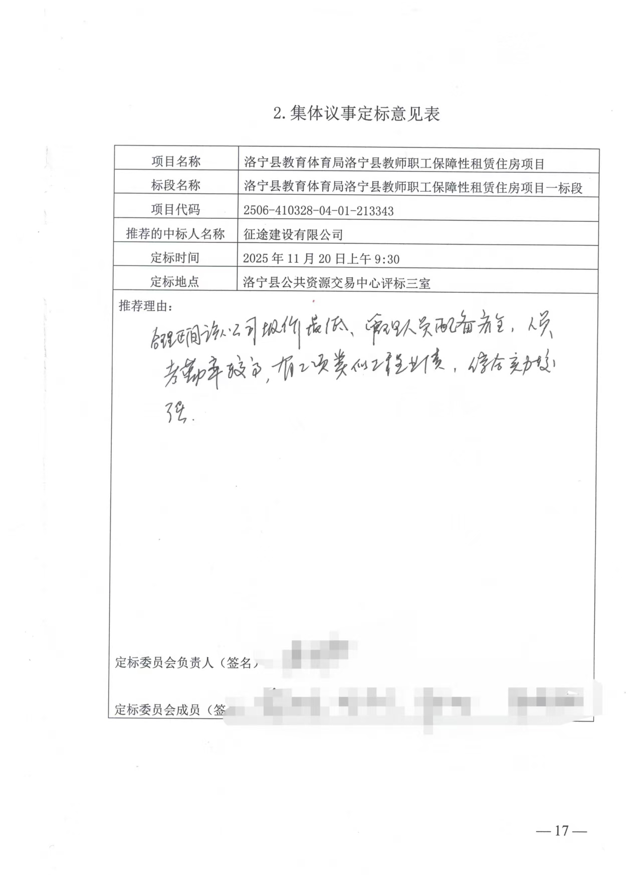******体育局洛宁县教师职工保障性租赁住房项目进行公开招标,按规定程序进行了开标、评标、中标候选人公示及定标,中标候选人公示期内未收到投标人及其他利害关系人的异议(质疑),现就本次招标的中标公告如下: