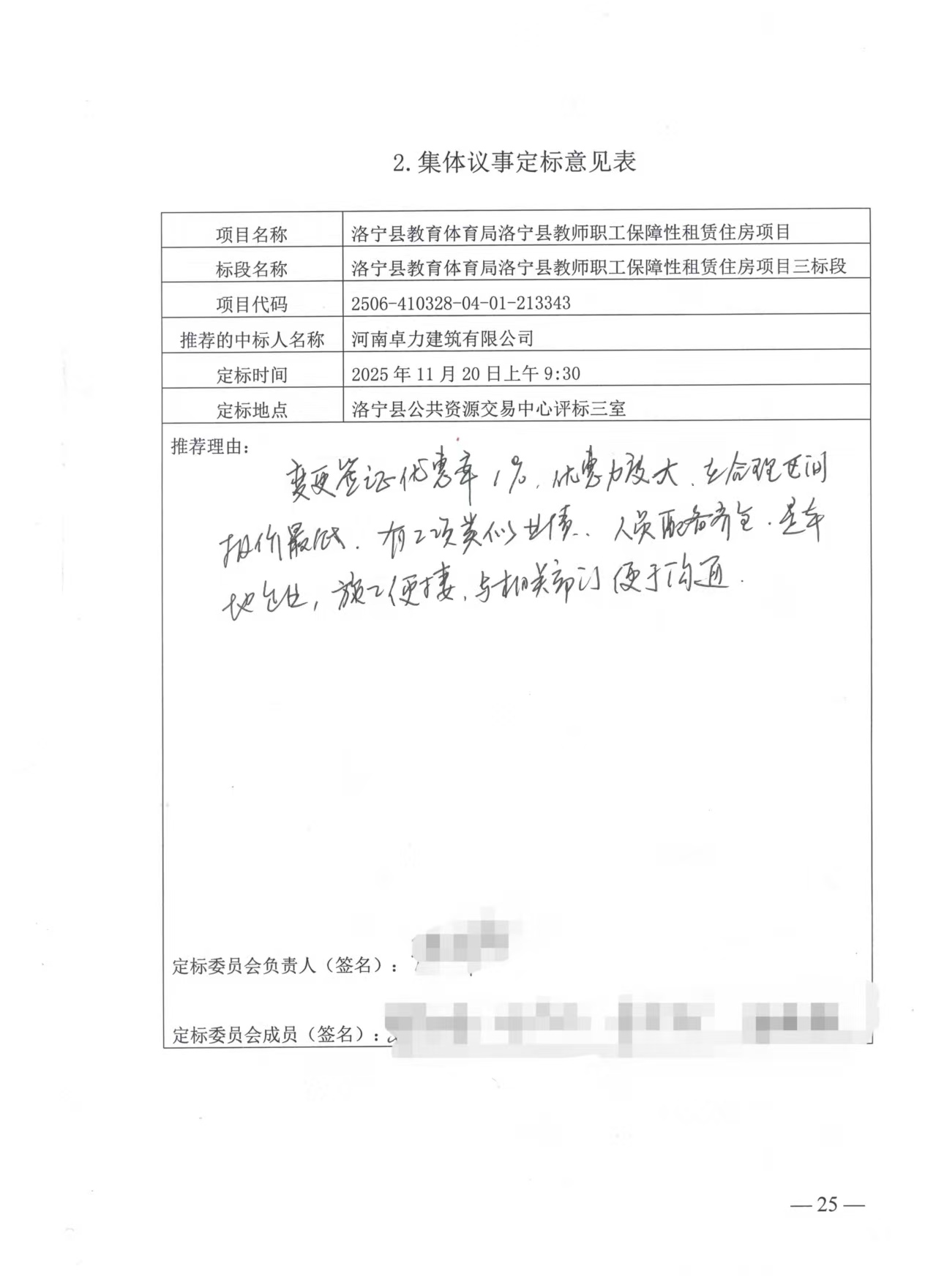 ******体育局洛宁县教师职工保障性租赁住房项目进行公开招标,按规定程序进行了开标、评标、中标候选人公示及定标,中标候选人公示期内未收到投标人及其他利害关系人的异议(质疑),现就本次招标的中标公告如下: